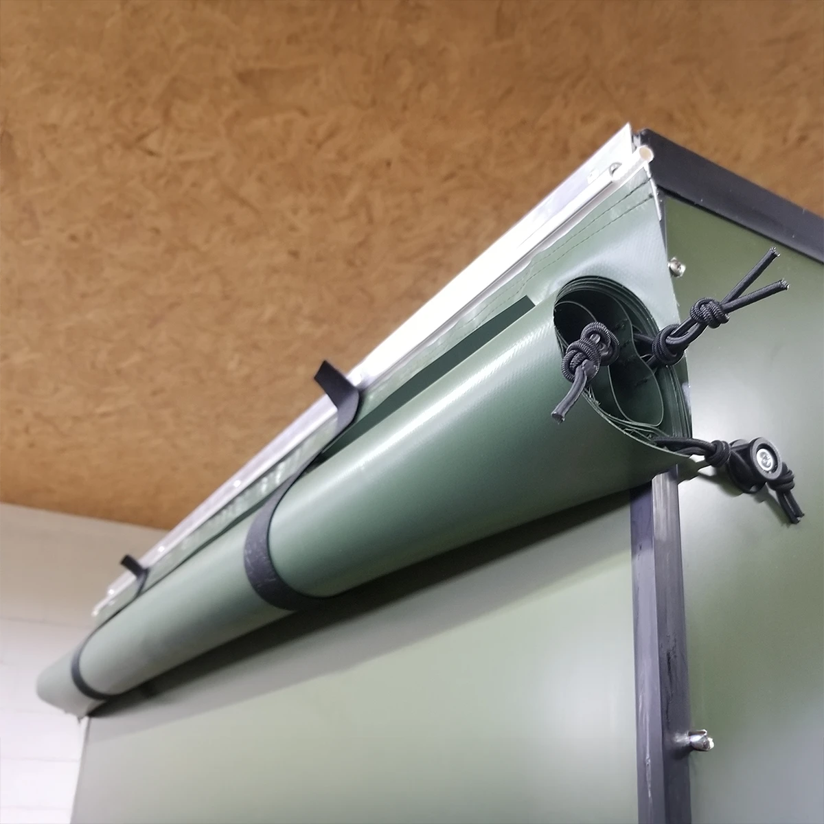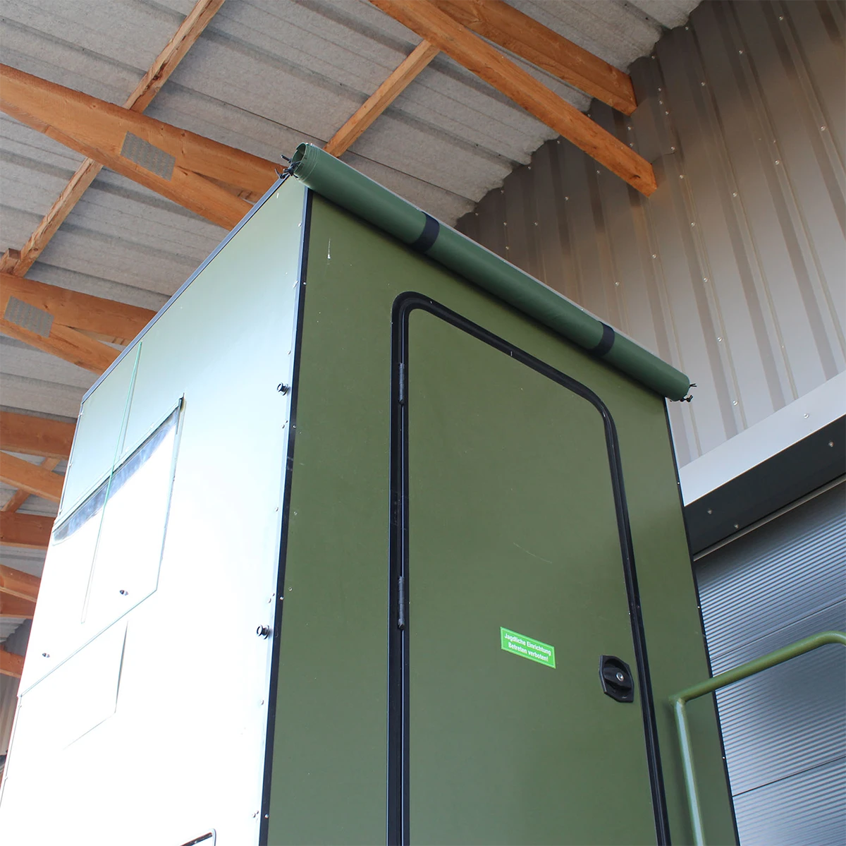 Die kleinere Version des Regenschutzes für unsere mobile Jagdkanzel. Über eine Schiene über der Türe wird die ausrollbare Plane angebracht und im ausgerolltem Zustand seitlich an der Kanzel befestigt. So ist die Türe auch im abgekipptem Zustand wasserdicht, ohne großen Aufwand.